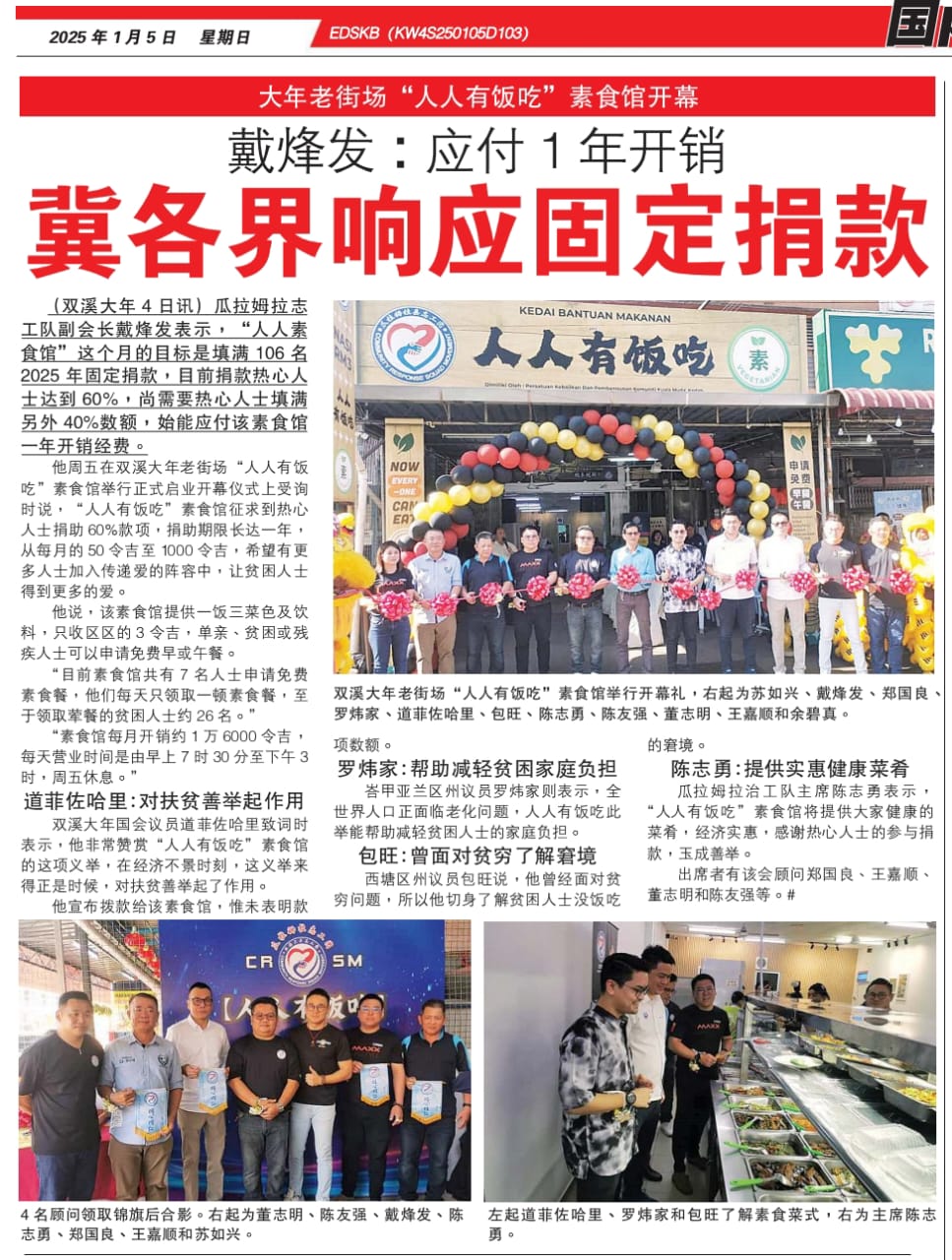 *(Sungai Petani, 3rd) – The "Food for All" vegetarian restaurant, initiated by the Kuala Muda CRSM Volunteer Team, officially opened today after a month-long soft launch. Approximately 60% of sponsorships have been secured, with 40% still needed from the community to sustain this meaningful cause.*